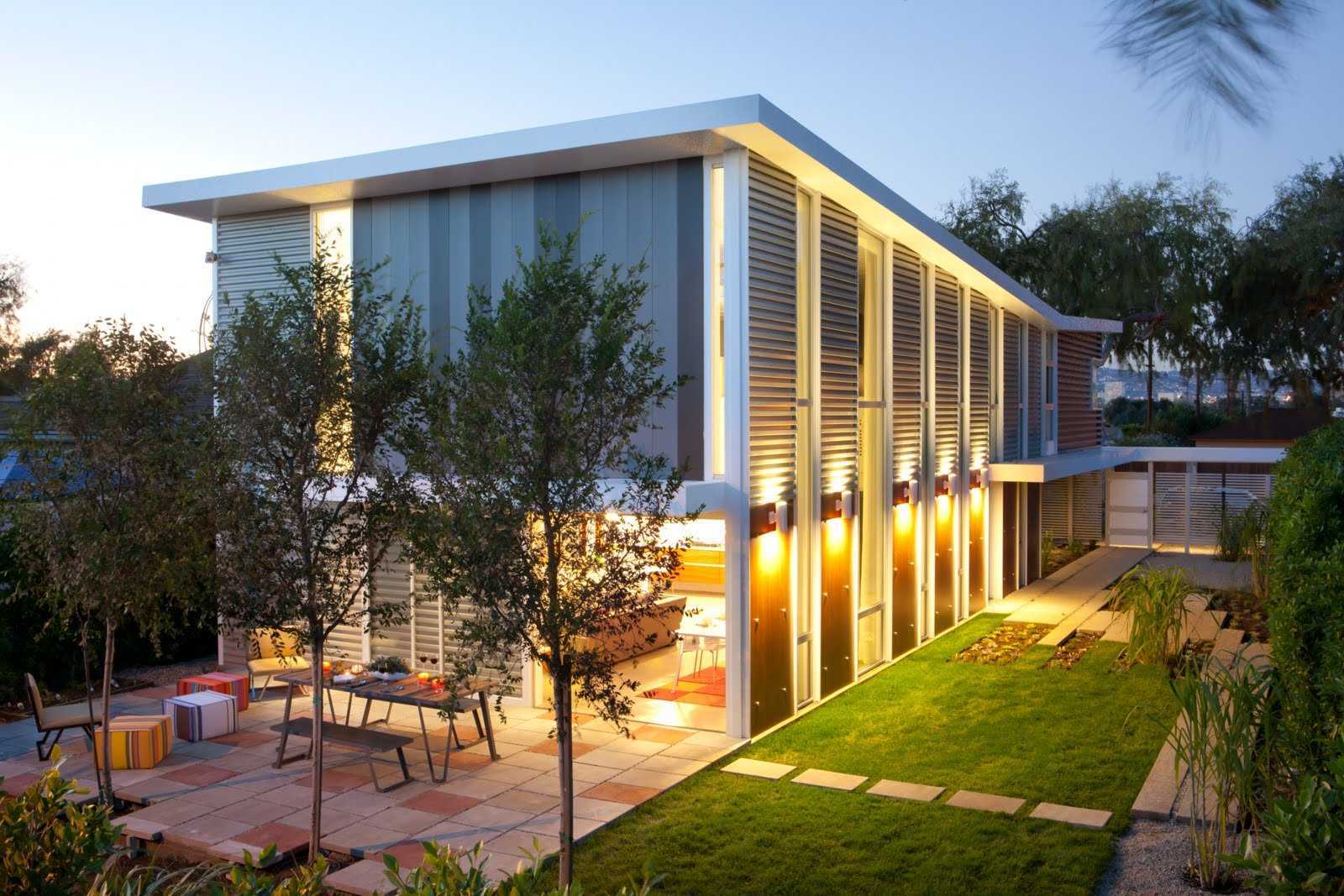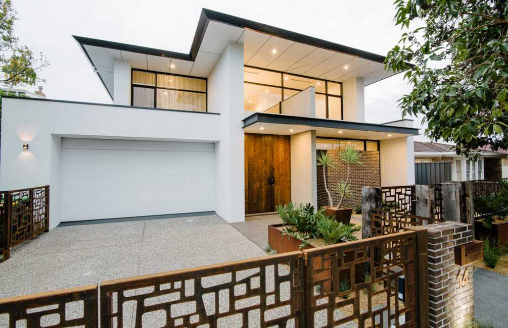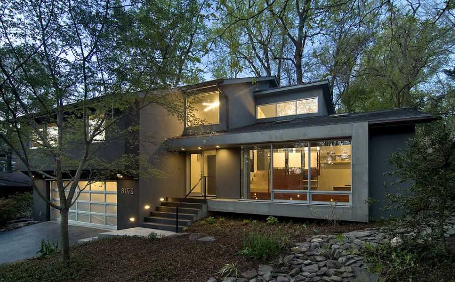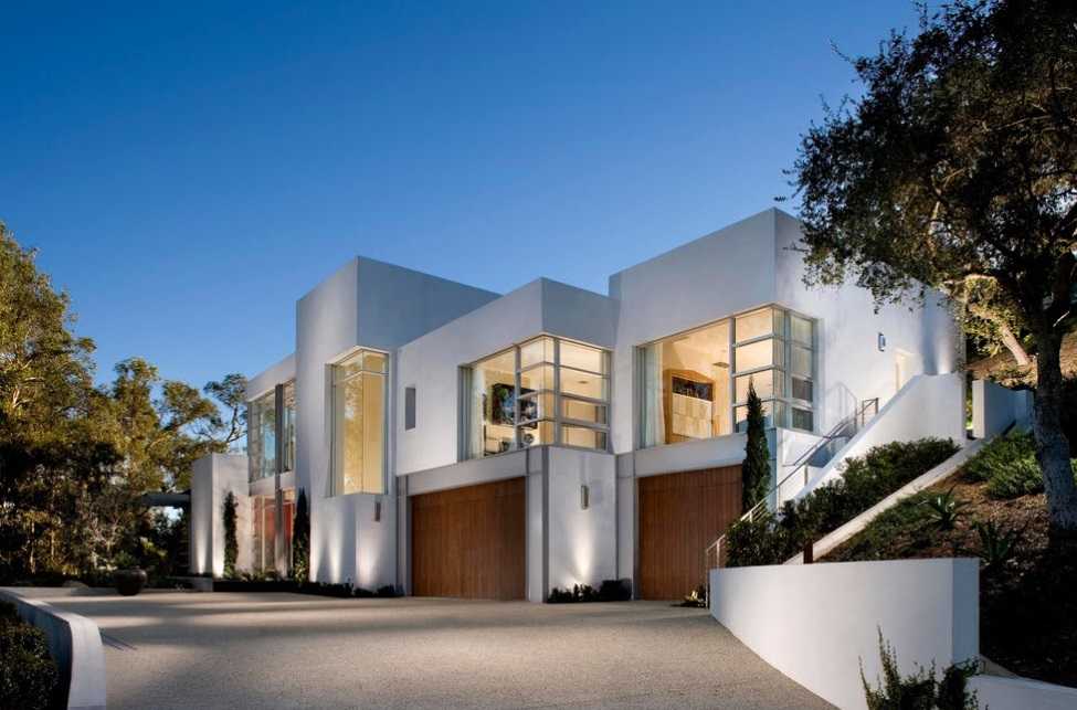 Фасады домов отличает использование большого количества стекла во внешней отделке, что увеличивает пространство. Интенсивное освещение заменяет декор. Кроме освещения, изящность фасаду придают и глянцевые, блестящие материалы в его отделке. Материалы фасадов – это, как правило, искусственные материалы: пластик, металл, стекло или бетон. Часто встречаются блокированные дома-коттеджи. Фасад часто выполнен из крупных бетонных блоков. Или же это могут быть каркасные и модульные дома, выстроенные из современных СИП-панелей. Они наполнены внутри деревянной стружкой или пенопластом, что позволяет сохранять тепло в доме в холодное время года.