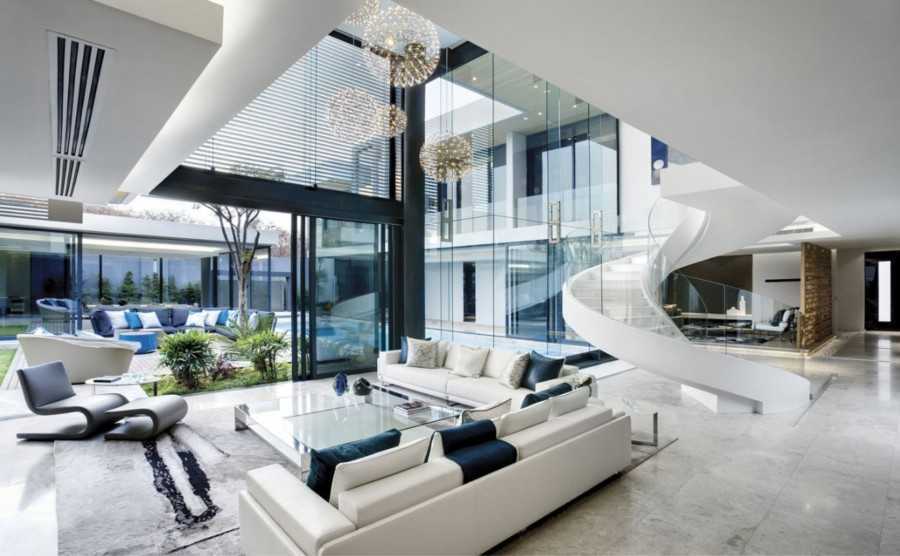Помимо этого застекляют двери, делают стеклянными ограды балконов (никаких ажурных перил и балюстрад), бортики бассейна… В общем, интегрируют стекло в постройку любым возможным способом.