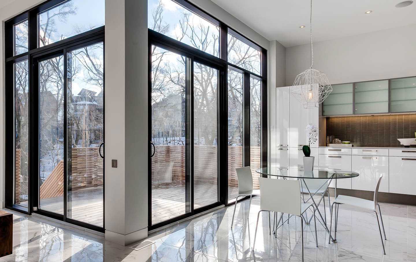 Чтобы заполучить максимальное количество солнечных лучей, фасадную часть дома нередко застекляют полностью. Там, где климат более суровый, можно ограничиться просто большим, строгой формы окном.