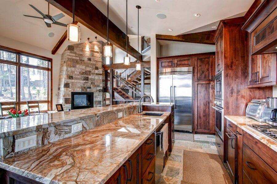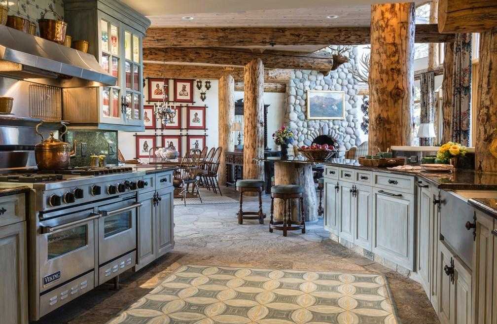 Модные керамзитовые и гранитные поверхности легко вписываются в альпийский интерьер. Предпочтение чаще отдается серому цвету. Если в кухне много темного дерева, предпочтение отдается теплым и стильным бежевым оттенкам.