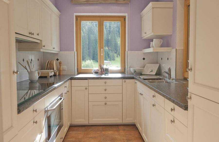 Например, кухня в «Chalet Sandhof», находящемся в городе Лех, самом дорогом горнолыжном курорте, демонстрирует вполне современный облик. Окрашенные стены, плитка, белая мебель, гранитные рабочие поверхности. Из традиционного интерьера остались керамическая посуда и каменный подоконник.