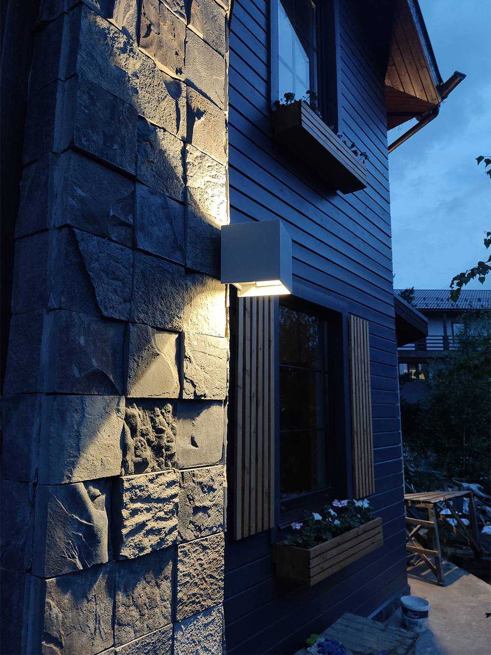 Когда работы подходили к концу, настало время купить светильники для фасадного освещения. В «Леруа Мерлене» были светильники за 1000—2000 Р, но почти все они давали рассеянный свет. Нам же хотелось четкой границы света, чтобы включенный светильник рисовал треугольник. Кроме того, два светильника у нас были запланированы на скошенных углах дома и должны были подсвечивать стену на всю высоту. То есть требовался мощный направленный свет.