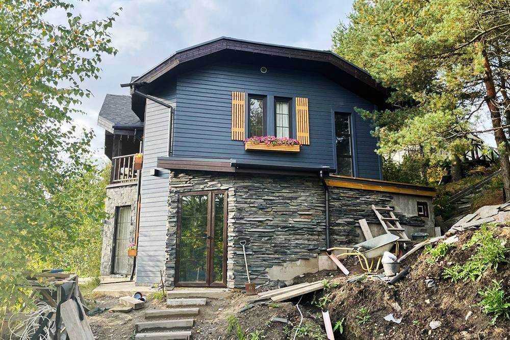 Мы с женой пришли к выводу, что обшивать фасад надо преимущественно доской, то есть к дереву по возможности крепить дерево. При этом отказались от белого цвета — это непрактично: такие стены легко пачкаются, на них видны любые огрехи. Например, на крашеных белых досках будут заметны сучки и трещины. Еще я опасался, что белая деревянная обшивка будет напоминать дешевый сайдинг. Поэтому мы нацелились на укрывистую краску приглушенного сине-графитового цвета.