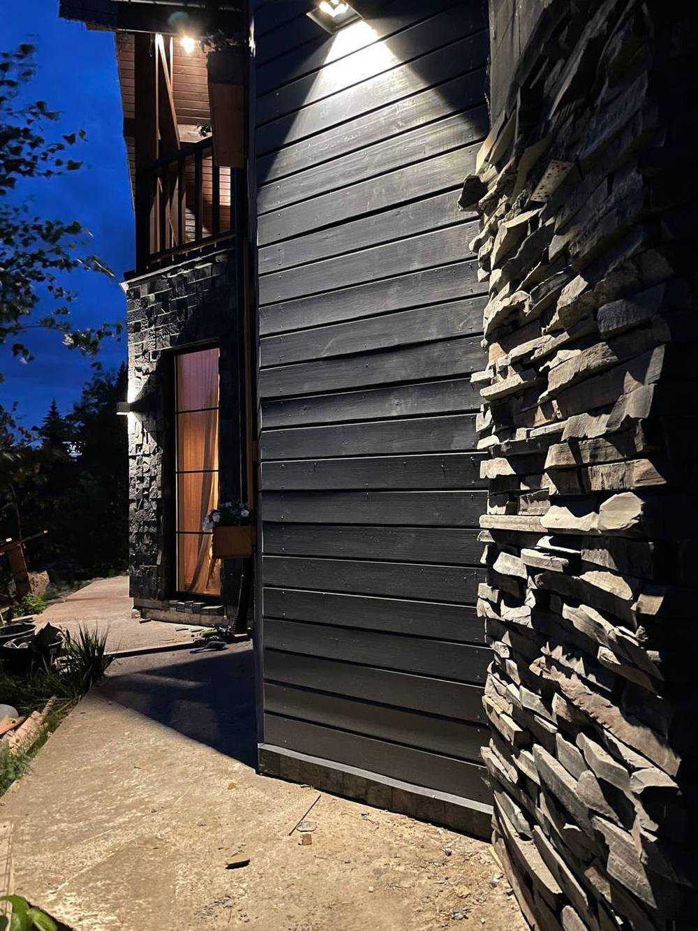 В качестве основного материала обшивки мы выбрали планкен — шлифованные доски толщиной 2 см со скошенными краями. Их и запланировали покрасить в сине-графитовый.
