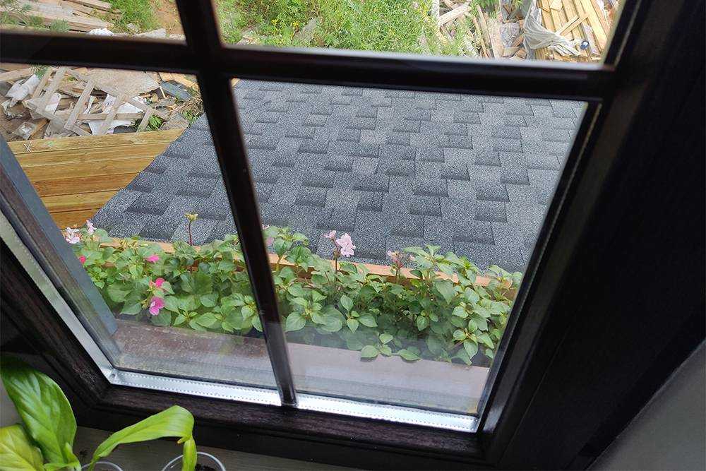 В пластиковые кашпо мы потом посадили цветы — петунии, пеларгонии и бальзамин. Каждая кадка с землей весит около 20 кг. На лицевой стороне ставни сделали только у нижних окон, верхние получились бы слишком близко к дранке и слились бы с ней На зиму кашпо можно легко убрать — просто вытащить из ящика. Под этим сдвоенным окном общая длина посадки — 1,2 метра