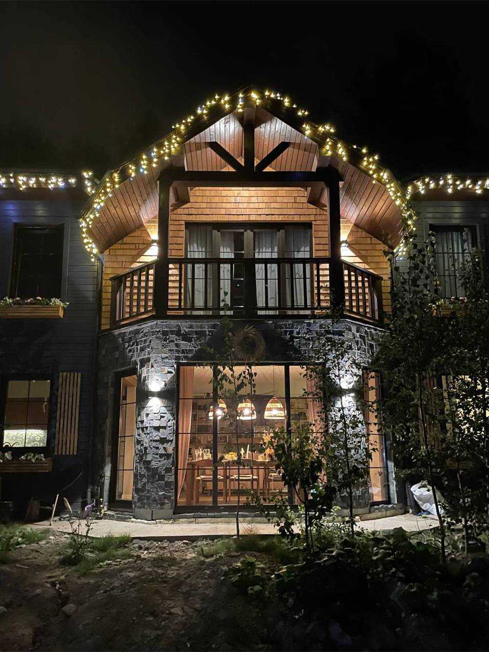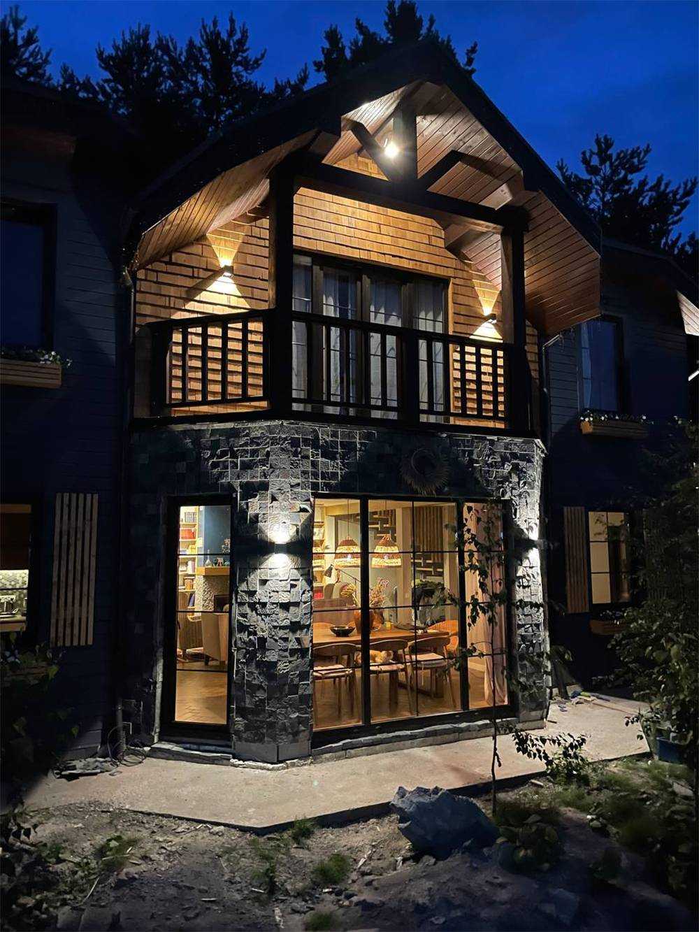 Сделали подсветку фасада. Еще до обшивки фасада планкеном я дал рабочим задание протянуть электрический медный кабель сечением 1,5 мм² к шести разным точкам на фасаде. Кабель тянется последовательно от точки к точке и питается от одного выключателя в доме.