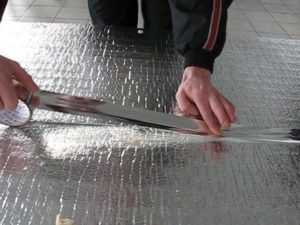 Стройматериал укладывается таким образом, чтобы получался нахлест фольги на стены (около 5 см), а образовавшиеся стыки проклеиваются алюминиевой изоляционной лентой.