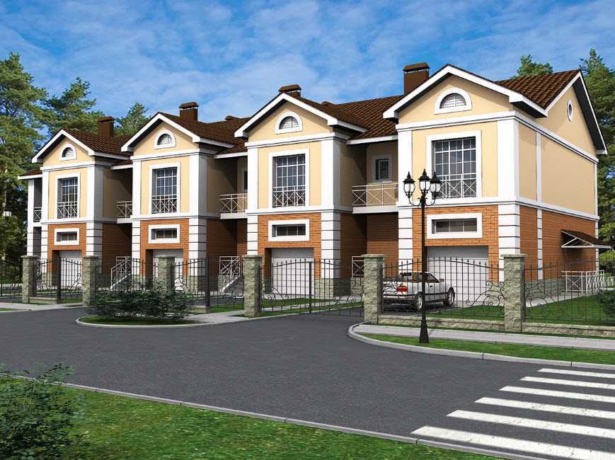 Каждая квартира (секция) в таунхаусе имеет 2 или 3 этажа и сблокирована с такими же домовладениями с обеих сторон, но имеет отдельный вход. Количество таких блоков в комплексе, обычно, не превышает 10.