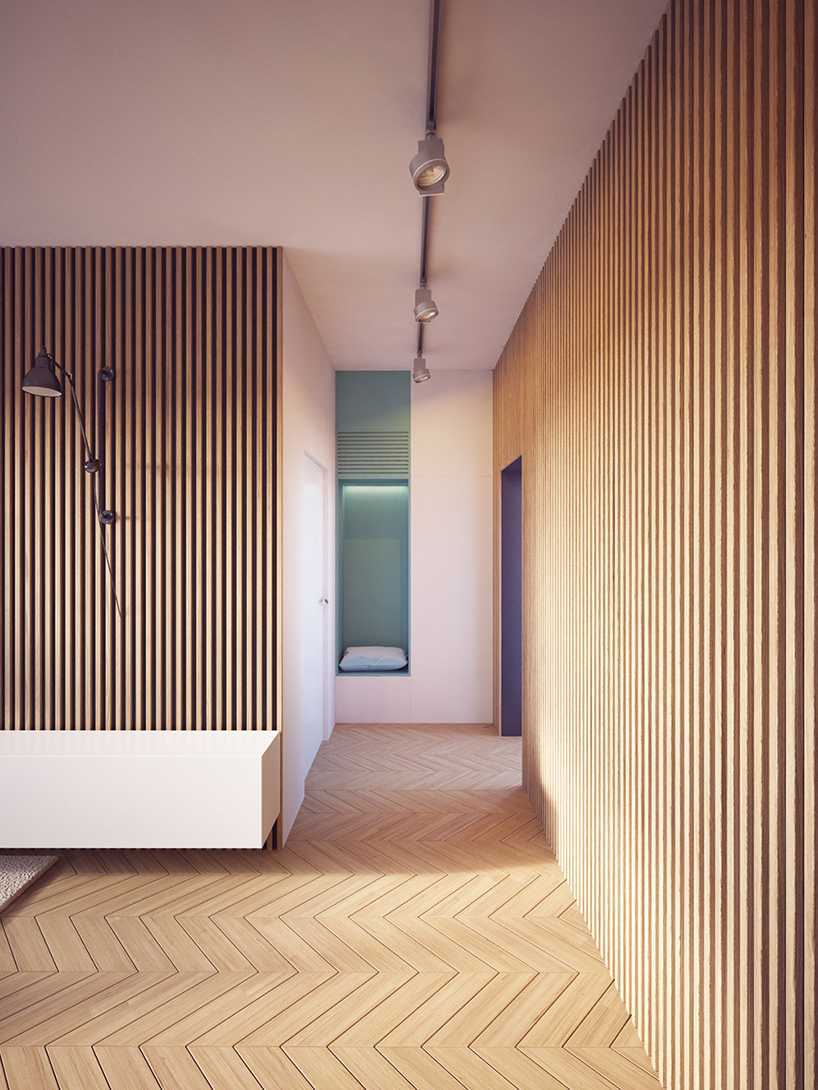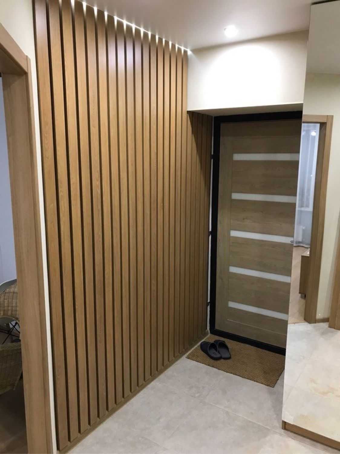 - Прихожая. Использование деревянной отделки в этом помещении особо уместно. На ламелях можно закрепить крючки, вешалку, зеркало и светильники.