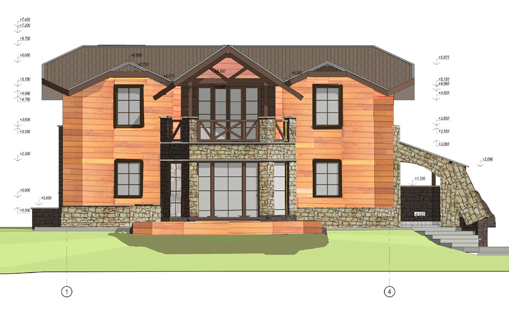 Этот вариант фасада я нарисовал сам в «Фотошопе». Эркер и цоколь отделаны камнем, все остальное — деревянное