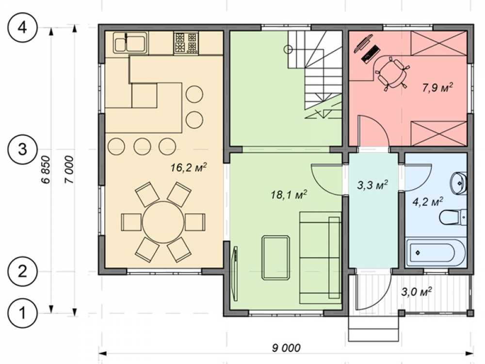 Большая семья, как правило, редко выбирает между небольшой площади территориями. Чаще всего дома 7х9 строятся именно для семей от четырёх человек. Таким образом, останется ещё место под одну комнату, которая будет использоваться для гостей.