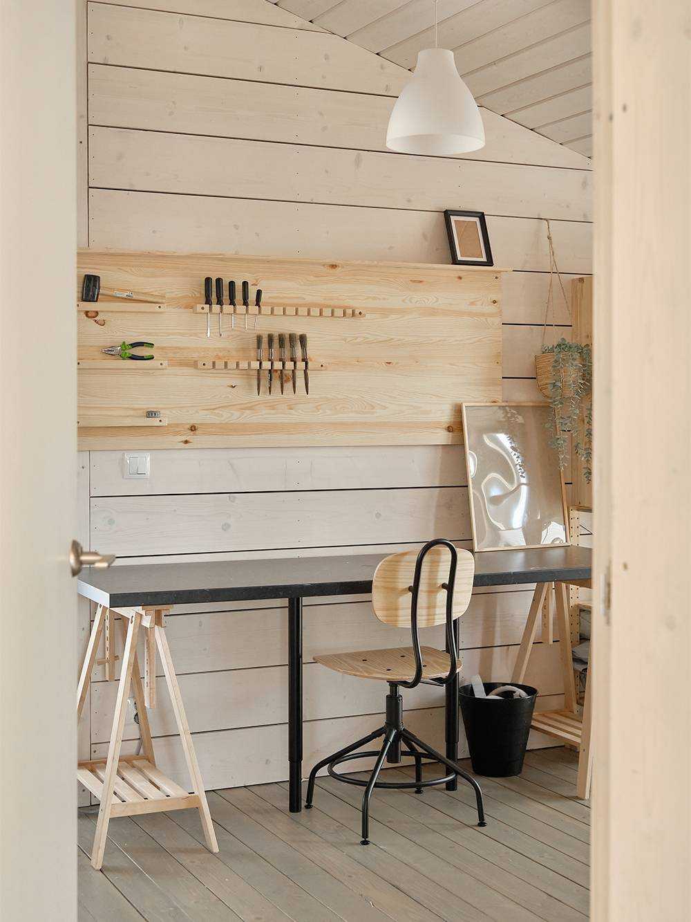 Не обязательно ставить кровать. Раскладной диван не так уж и плох. А рядом стол с компьютером. Техническое помещение объединяют с кладовой и местом, где стоят стиральная машина, сушилка, гладильная доска. Не всегда это возможно. Если дом будет отапливаться газом, то учитывают правила безопасности. Но при электрическом обогреве — совмещать проще.