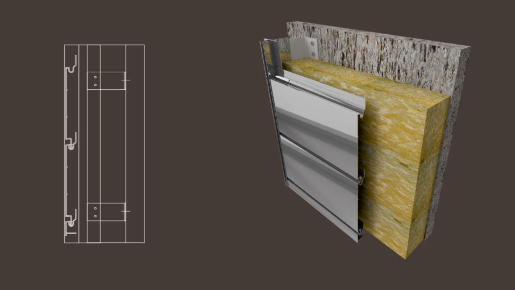 - “Вентилируемый” фасад. Часто применяется к утеплению под сайдинг. В таком случае между минеральной ватой, закрепленной на стене, и наружным облицовочным слоем создается воздушная прослойка. Ее толщина должна быть просчитана по соответствующей формуле. Для образования зазора на дом необходимо прикрепить соответствующую металлическую или деревянную конструкцию. Ее основное предназначение заключается в фиксации облицовочных материалов. Это может быть вагонка, плитка, камень, фиброцементные плиты и т.д.